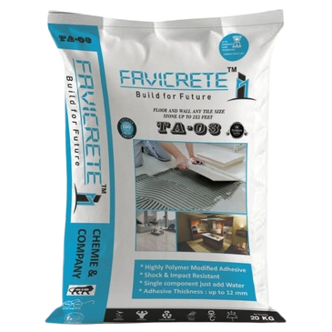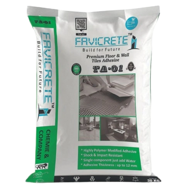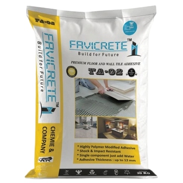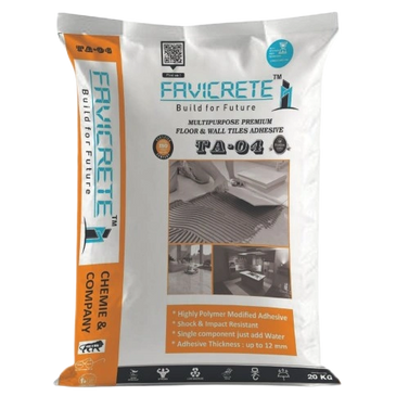 A Multipurpose High Fibre Ploymer Modified Adhesive For Interior and Exterior for Any Tile Size Application Favicrete TA-04 Multipurpose Floor and Wall Tiles and Stones Adhesive is designed to mix with water and has a convenient open time with High Adhesive is designed to mix with water and has a convenient open time with high adhesion & workability.